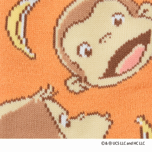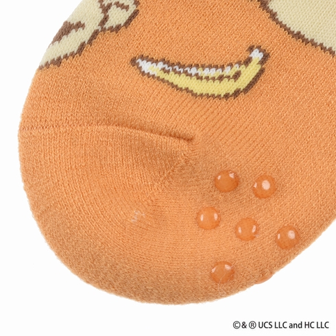 おさるのジョージのクルー丈ソックスです。可愛らしいジョージの顔がたくさんデザインされたアイテムです。総パイルでふわふわな履き心地、足裏には滑り止めがついていて安心です。