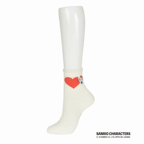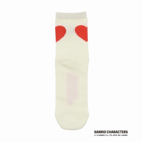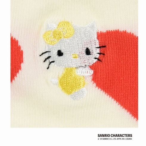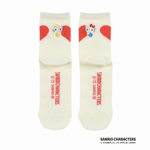 サンリオの人気キャラクター、キティちゃんのクルー丈ソックスです。片足ごとにハートを持ったキティちゃんとミミィちゃんが刺繍されています。両足を揃えるとひとつのハートになるバックデザインもポイントです。