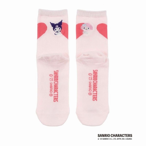 サンリオの人気キャラクター、クロミとマイメロディのクルー丈ソックス2足組です。片足ごとにハートを持ったクロミとマイメロディが刺繍されています。両足を揃えるとひとつのハートになるバックデザインもポイントです。