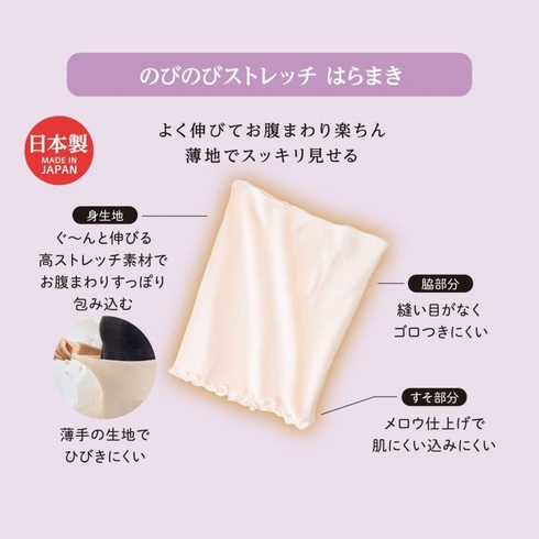 美温活シリーズののびのびはらまきです。安心の日本製。。ぐ~んと伸びる高ストレッチ性の腹巻で着脱やつけている間もラクラクあったか、薄地なので洋服のしたに着ても着ぶくれしません。レーヨン混の優しい肌触りが病みつきになりそうな商品です。