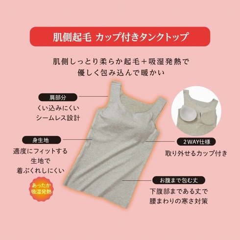 | 特徴 | ■カップ取り外し可能 ■肌側やわらか起毛 ■吸湿発熱 ■シームレス設計 |
