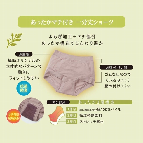 美温活シリーズ「よもぎ蒸し」のようにデリケートゾーンから温められるショーツ。福助オリジナルの立体的なパターンで動きにフィットするので動きやすく、お腹やそけい部はゴムなしで、くい込みにくく締め付けにくいので毎日でも着用していただけます。マチ部分の3層構造により体の中心部分からあたためることができ、冷えが気になる方に嬉しいアイテムです。