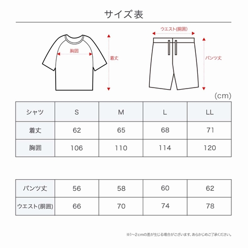 サイズ | 【Mサイズ】 着丈:65cm,チェスト(胸囲):110cm,パンツ丈:58cm,ウエスト:70cm【Lサイズ】 着丈:68cm,チェスト(胸囲):114cm,パンツ丈:60cm,ウエスト:74cm【LLサイズ】 着丈:71cm,チェスト(胸囲):120cm,パンツ丈:62cm,ウエスト:78cm |