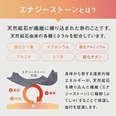 天然鉱石を練り込んだエナジーストーン生地を、トップスの背当てとパンツの腰あて部分に使用しています。エナジーストーンの効果でリラックスや快適をサポートしてくれ、ルームウェアやちょっとしたスポーツにおすすめのウェア上下セットです。エナジーストーンとは:天然鉱石が繊維に練り込まれた糸の事。