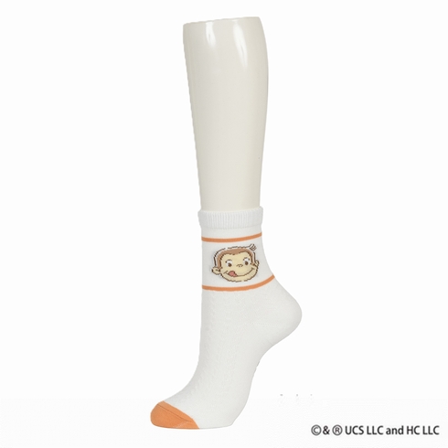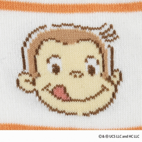 大人気キャラクター「おさるのジョージ」から、白を基調としたホワイトソックスが登場。舌を出したお茶目な表情のジョージに、ホワイトに映えるオレンジのラインが効いたソックスです。