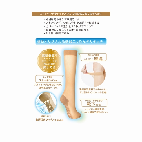 | 特徴 | ■足底大メッシュ ■つま先・かかと補強 ■口ゴム綿混 ■かかと付き ■消臭加工 ■冷感加工 ■ハイソックス丈 |